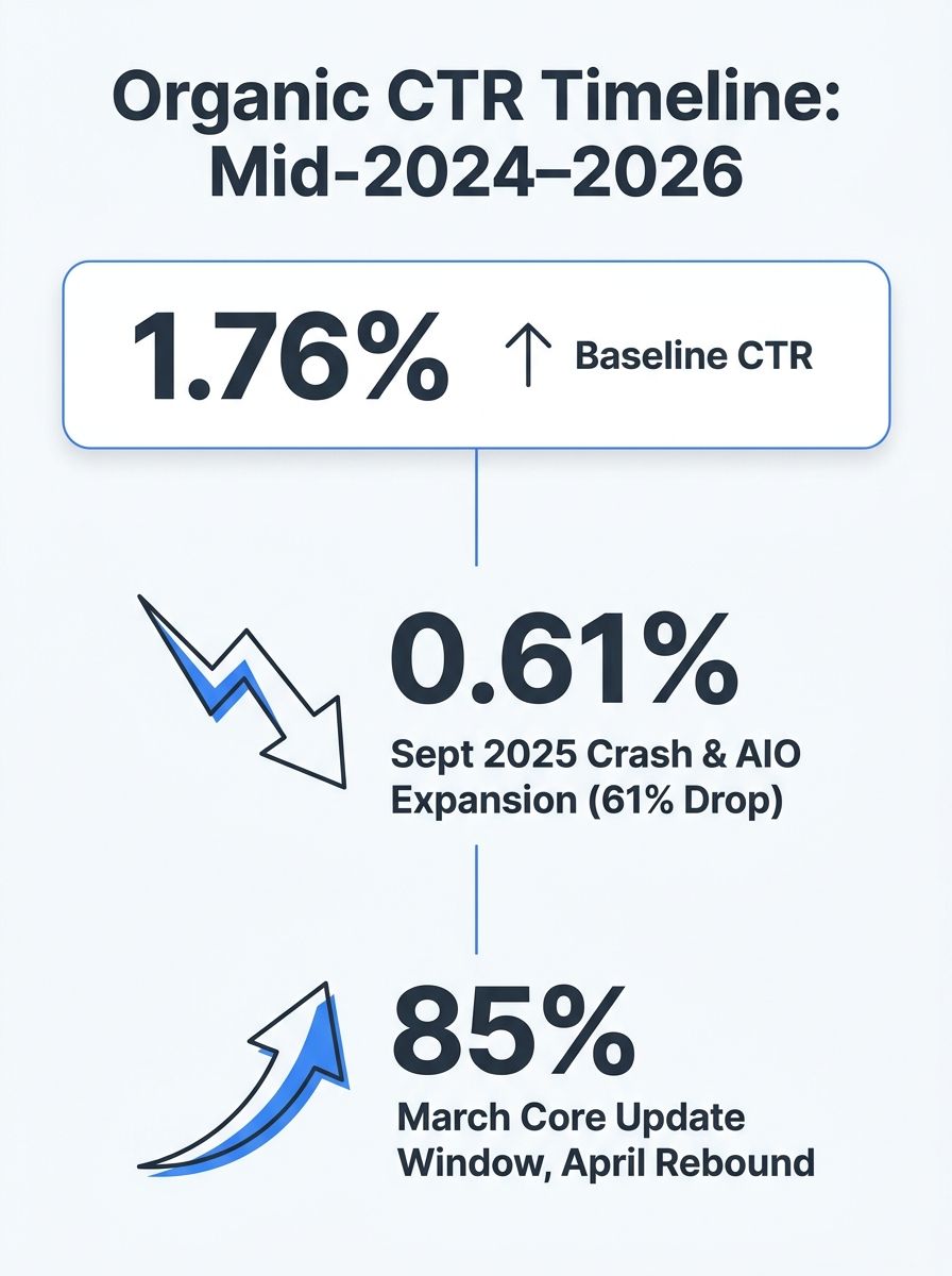 The data as of this week tells a story with clear phases. The initial AIO rollout through 2024 and early 2025 steadily eroded organic CTR. The September 2025 study quantified the damage at 61%. The erosion extended even to non-AIO queries, with a 41% CTR decline that pointed to broader behavioral shifts. The March 2026 core update reshuffled ranking signals and citation patterns. And now, in April 2026, the first credible rebound signal has appeared.