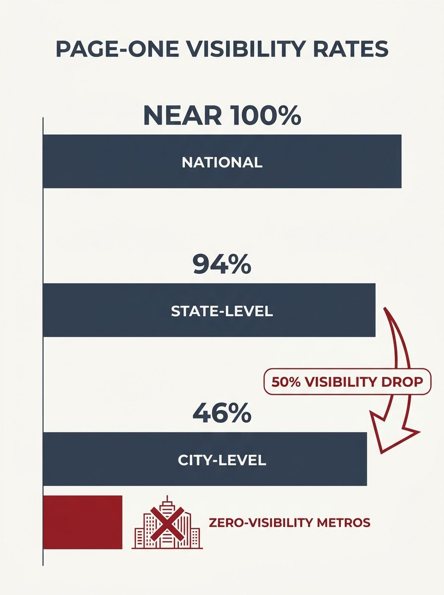 New York City, Seattle, and Billings, Montana returned zero page-one organic visibility for geo-modified queries in a Go Fish Digital analysis of 100 SERPs across all 50 U.S. states, regardless of how granular the location targeting was. Across the full dataset, page-one visibility dropped by 50% when searchers moved from state-level to city-level queries. At the state level, 94% of searches showed page-one results for the target site. At the city level, that number cratered to 46%. If your location-based SEO ranking strategy stops at the homepage, you're invisible in exactly the markets where purchase intent runs highest.
