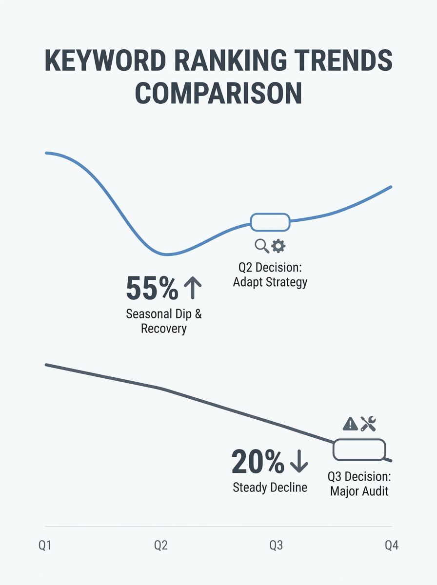 Here's why this matters in practice. Say you run a site about personal finance. Your "best savings accounts" page drops from position 4 to position 9 between January and March. If you only compare to the prior quarter (October through December), you might panic. But if the same page dropped from 4 to 8 during the same window the previous year and recovered by May, you're looking at seasonal keyword trends tied to post-holiday financial behavior shifts. The fix isn't a content overhaul. The fix is patience and maybe a date refresh.