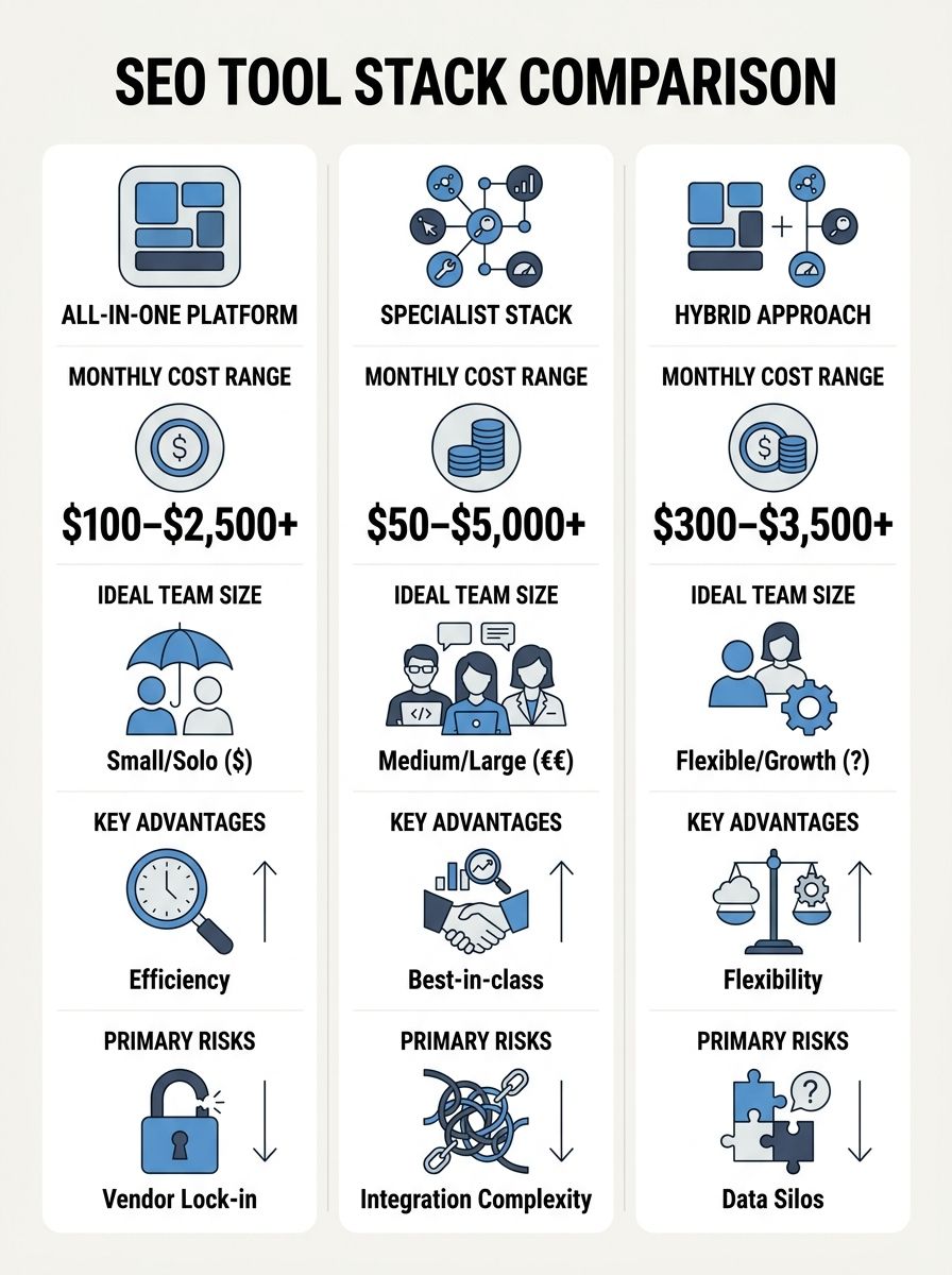 Specialist stacks produce the best raw data quality. When you're doing deep keyword research on specific query types, a purpose-built tool will surface opportunities that a generalist platform misses. Agencies that serve verticals with unusual search behavior—healthcare, legal, B2B industrial—often find that no single platform covers their needs adequately.
